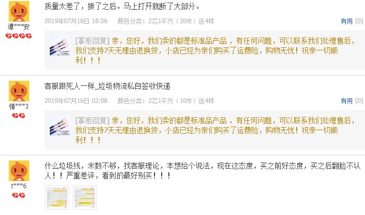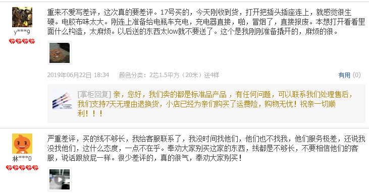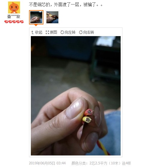 評價截圖有很多,我這邊就不一 一發(fā)出來了,總結(jié)幾個特征,冒充國標(biāo),截面積虛標(biāo),米數(shù)不足,導(dǎo)體斷線,鋁鍍銅,這個就是低價的本質(zhì),如果你是買回家當(dāng)擺設(shè)并且不怕刺鼻味的,盡可能多買點,其余用途作為晾衣繩都怕斷。